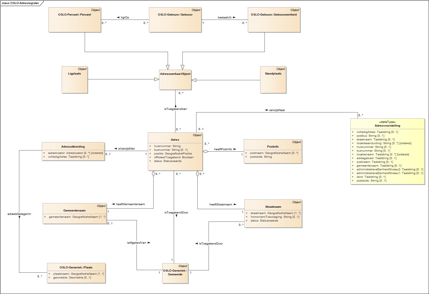 Adresregistratie vereist bepaalde kardinaliteiten, zo zijn een gemeentenaam en een straatnaam altijd verplicht. Een adres hoeft dan weer niet toegekend te zijn aan een adresseerbaar object, dit moet toelaten om adressen op te voeren nog voor ze officieel zijn gekoppeld aan bv. een gebouweenheid of perceel.