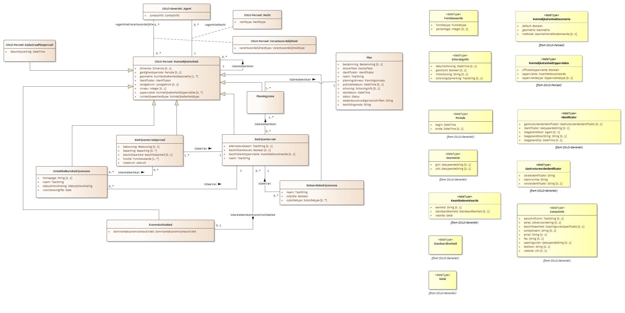 In Vlaanderen wordt er door Informatie Vlaanderen en de Algemene Administratie voor Patrimoniumdocumentatie (AAPD) gewerkt aan één authentieke bron voor perceelsinformatie (uniek percelenplan). Binnen deze bron wordt elk privaat/eigendoms- perceel in Vlaanderen uniek geïdentificeerd en gekenmerkt door een geometrische voorstelling, (bruikbaar in een schaalbereik van 1/250 – 1/5000 OF in lijn met de aanbevelingen in de INSPIRE dataspecificaties voor kadastrale percelen (link)). De AAPD vervult de rol van beheerder van deze bron en voert deze uit volgens de principes overeengekomen met Informatie Vlaanderen en gebruikers van perceelsinformatie in Vlaanderen. De gegevens in deze bron worden verspreid onder verschillende productvormen (Administratief perceel (ADP) in de Basiskaart Vlaanderen (GRB), kadastrale percelen (CaPa) in het kadastraal perceelsplan (CADGIS), …). Via dit initiatief wensen overheden in Vlaanderen in samenwerking met de Algemene Administratie voor Patrimoniumdocumentatie (AAPD) perceelsinformatie in Vlaanderen semantisch te modelleren. De resulterende standaard ‘percelen’ moet vlot kunnen worden hergebruikt door alle belanghebbenden. Dit is het applicatieprofiel van het OSLO traject Bedrijventerrein en beschrijft de relaties tussen de verschillende entiteiten.